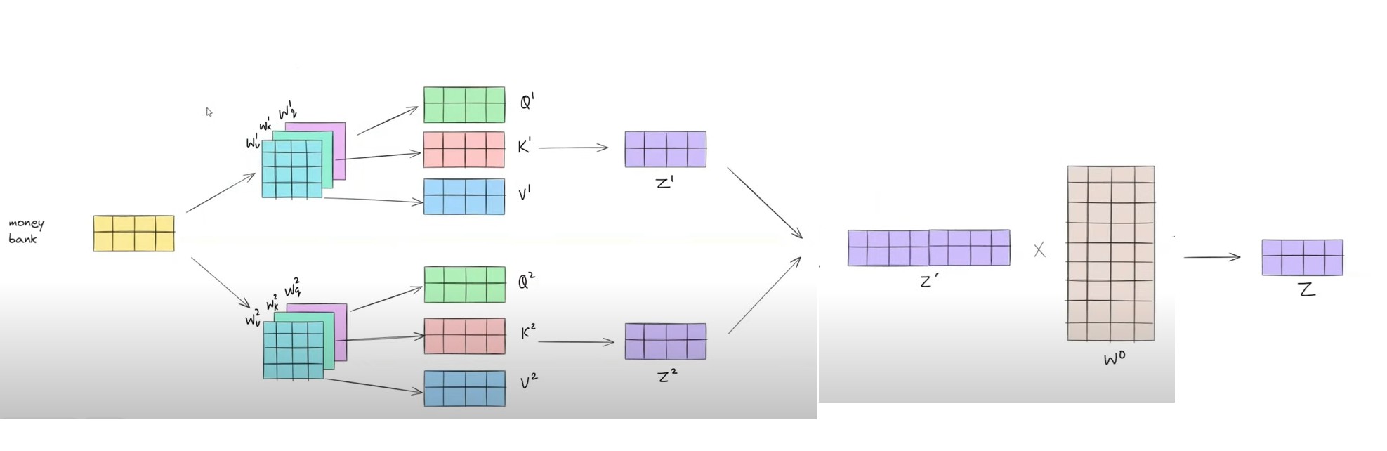 - For a single self attention technique we will have 3 metrices Wq(1), Wk(1), Wv(1)