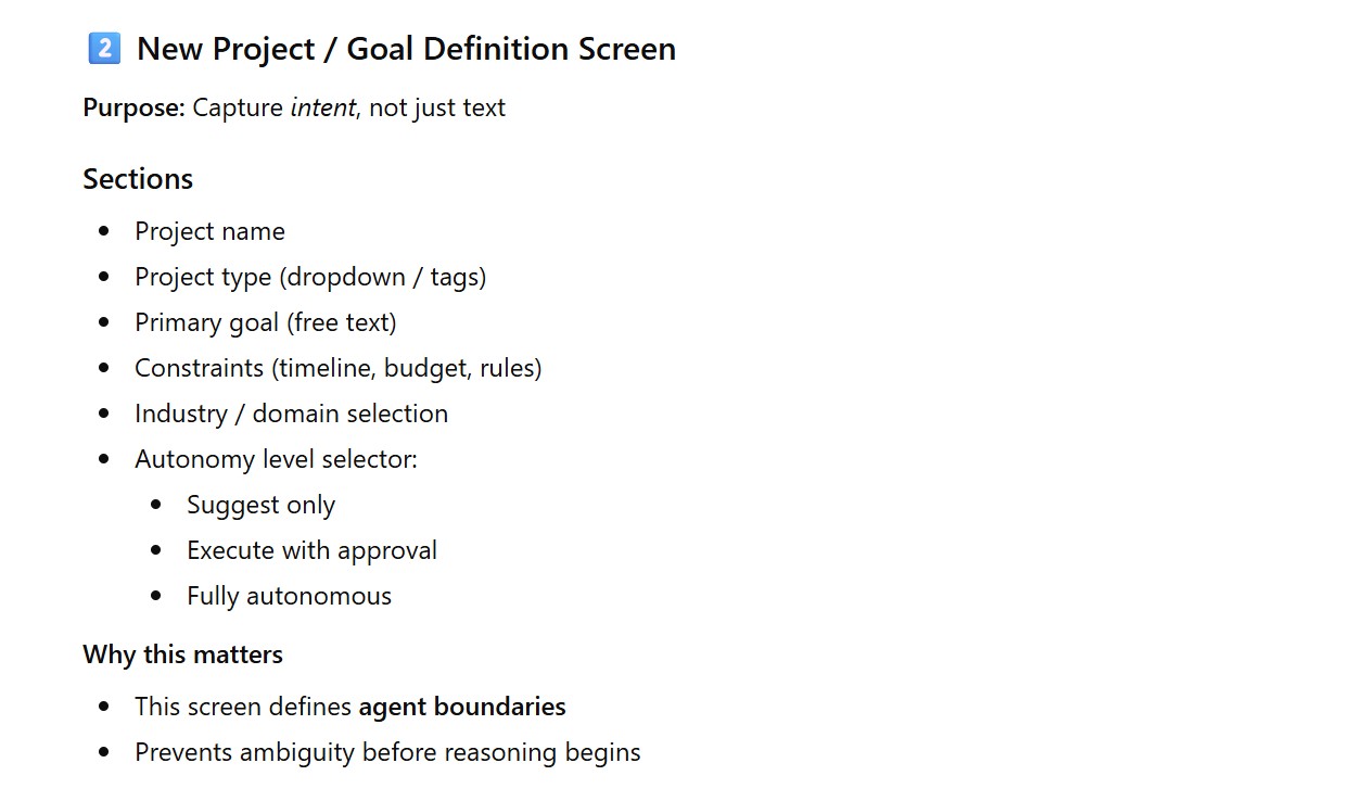 - New Project / Goal Definition Screen
