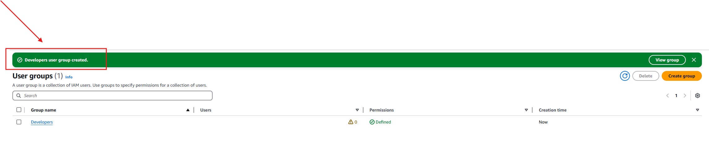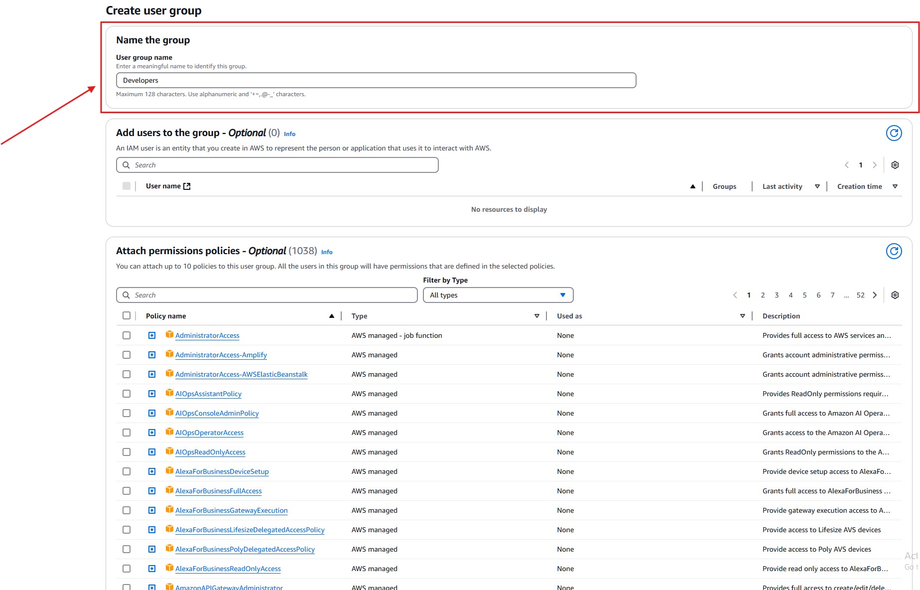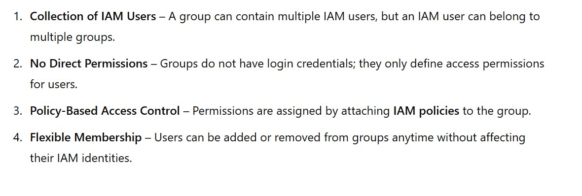 - Instead of assigning permissions to each user individually, you can create a group, attach policies to it, and then add users to that group.