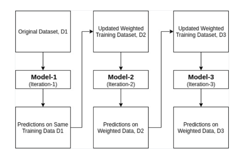 5. This process iterates until the complete training data fits without any error or until reaches the specified maximum number of estimators.