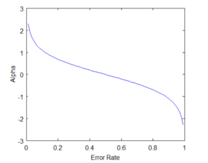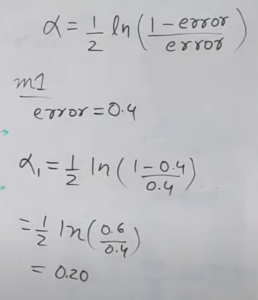 • If all the samples have been incorrectly classified, then the error will be very high (approx. to 1), and hence our alpha value will be a negative integer.
