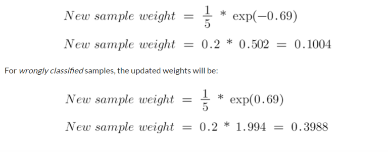 • It is positive when there is misclassification, and this will increase the sample weight from 0.2 to 0.3988