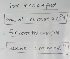 • After finding the importance of the classifier and total error, we need to finally update the weights, and for this, we use the following formula: