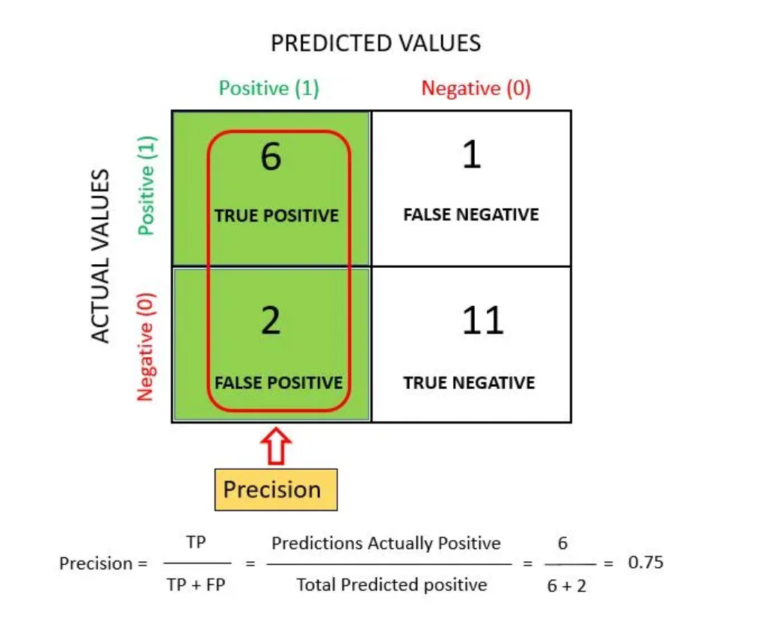 - It is a measure of correctness that is achieved in true prediction. In simple words, it tells us how many predictions are actually positive out of all the total positive predicted.