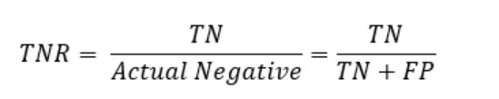 - Specificity is the ratio of number of actual Nos correctly predicted to the total number of actual Nos.