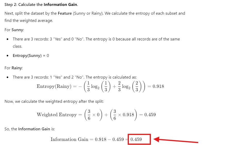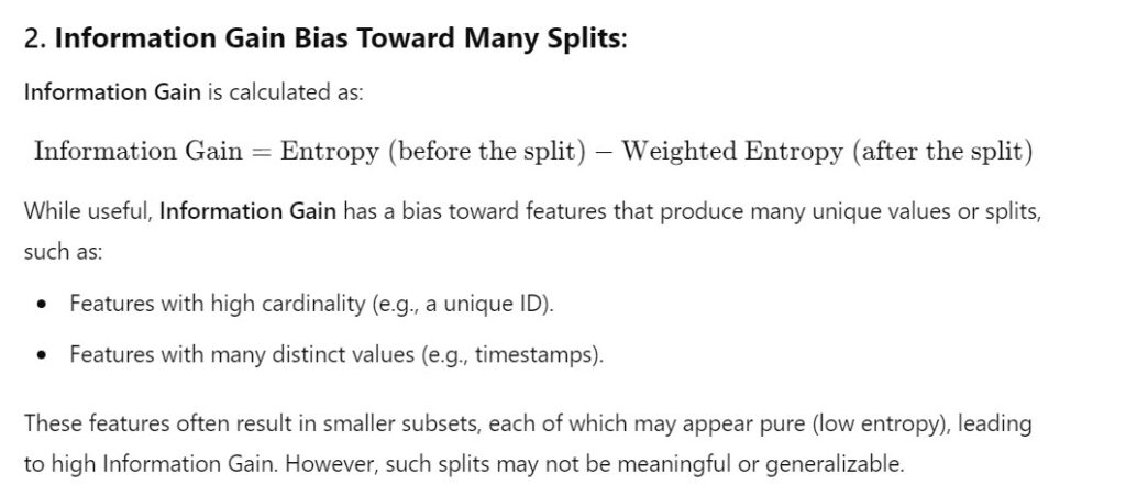 - While Information Gain measures the effectiveness of a feature in classifying the data, it tends to favor features with many distinct values (like a unique identifier).
