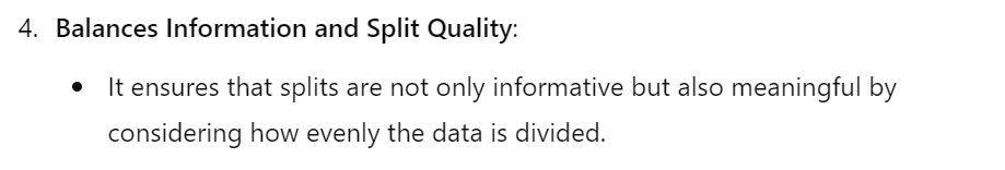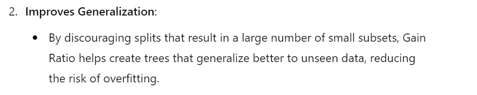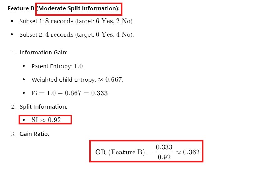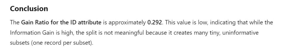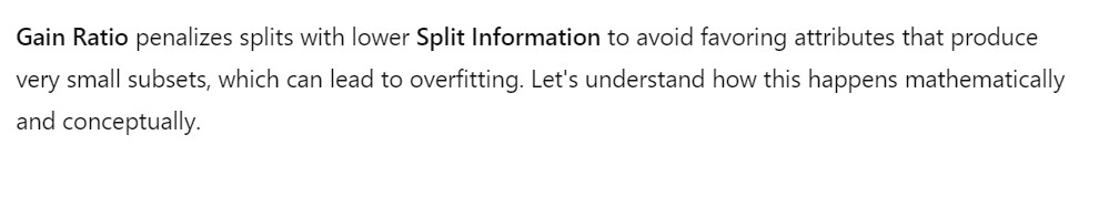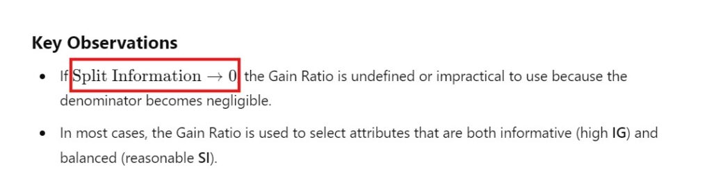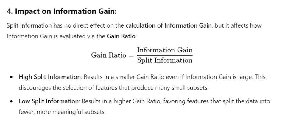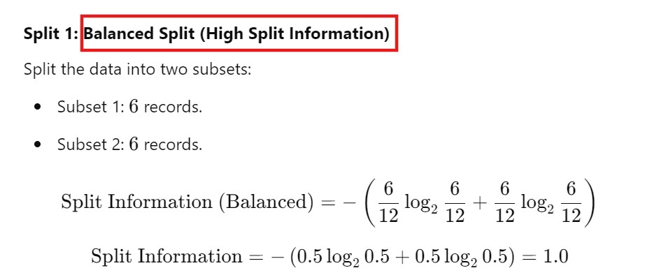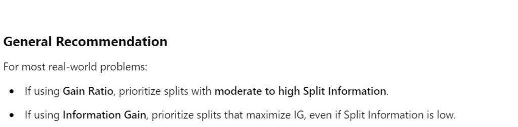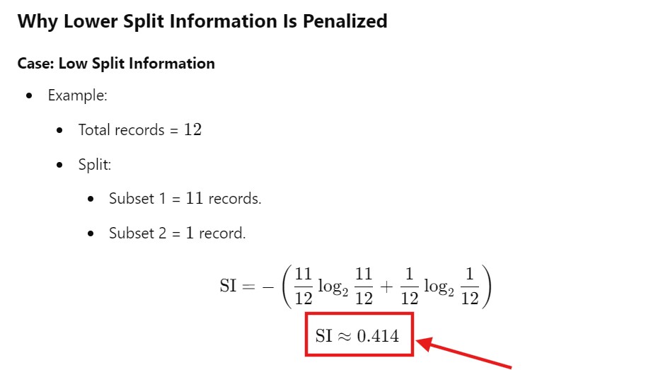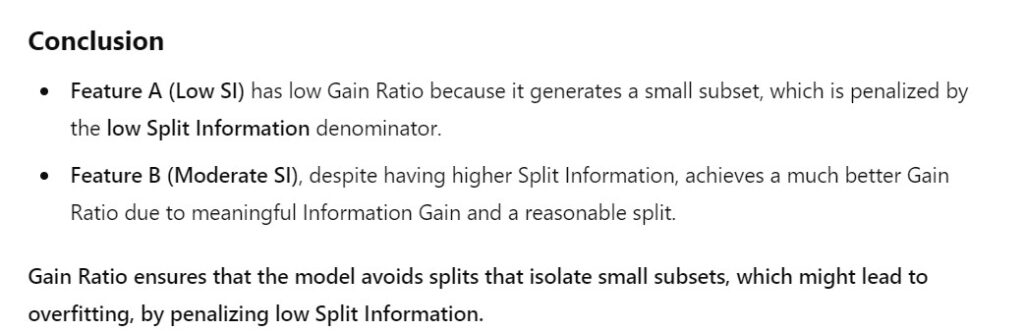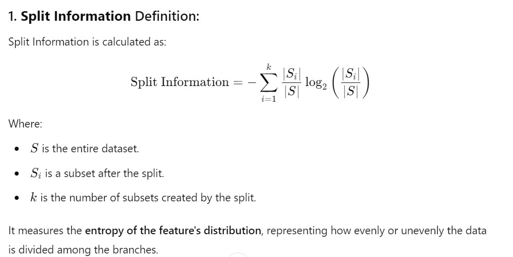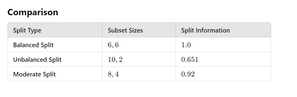 - Split Information measures how “uniformly” the data is distributed across the subsets.