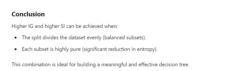 - Achieving higher Information Gain (IG) and higher Split Information (SI) simultaneously is possible when a split divides the data both meaningfully and evenly in terms of target variable purity and subset size. Here’s how: