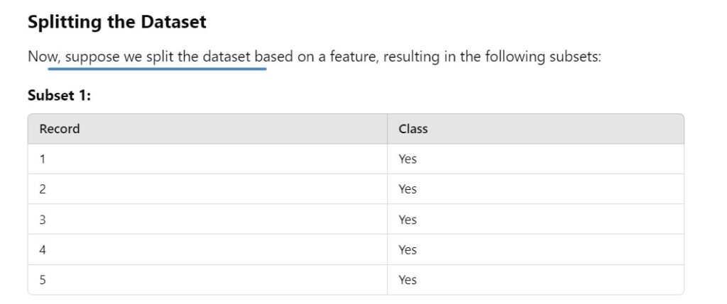 - In a decision tree, we aim to split the data in such a way that the resulting nodes (subsets) are as pure as possible (i.e., most of the data in the node belongs to a single class).