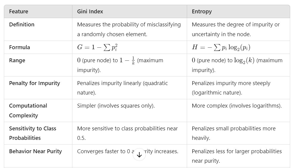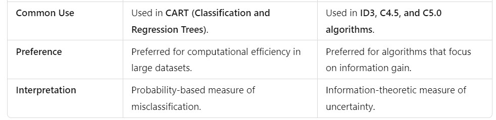 - It is used to determine the “impurity” or “purity” of a node and helps in selecting the best feature to split the data at each step.