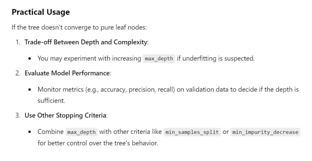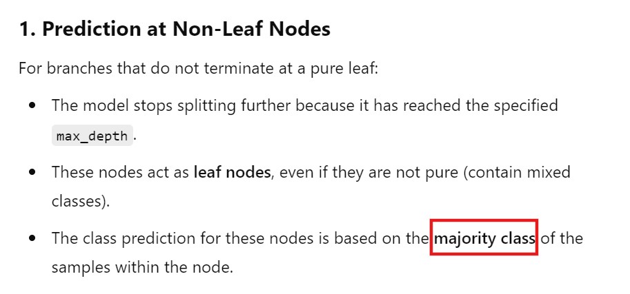- If a decision tree is trained with a specified maximum depth and it does not fully converge to a leaf node for all branches (i.e., the stopping condition is reached before some branches become pure or perfectly classify all samples), the following happens:
