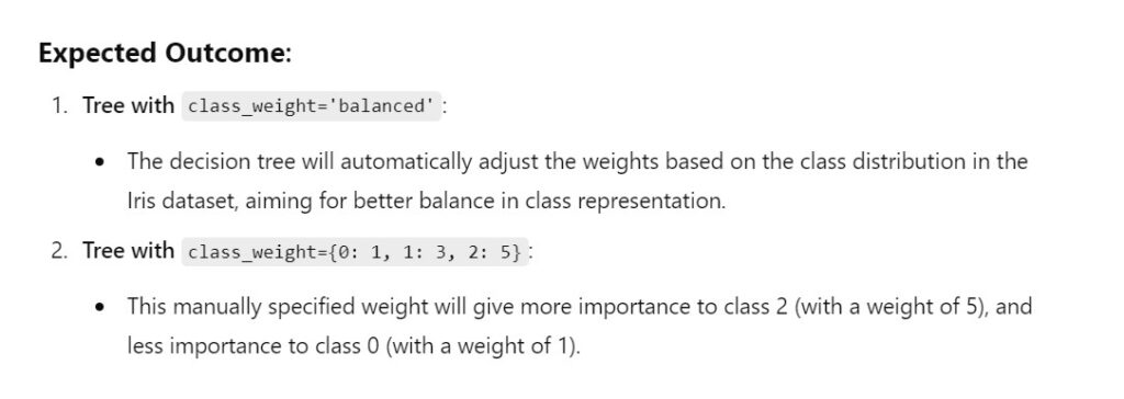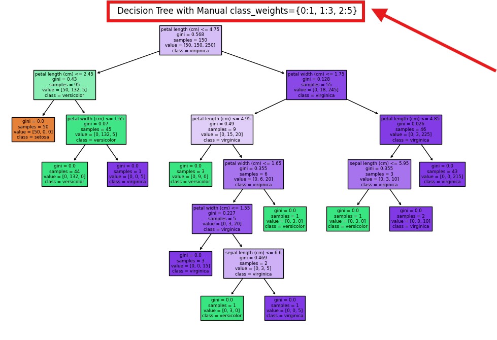 clf_manual = DecisionTreeClassifier(class_weight={0: 1, 1: 3, 2: 5}, random_state=42)
