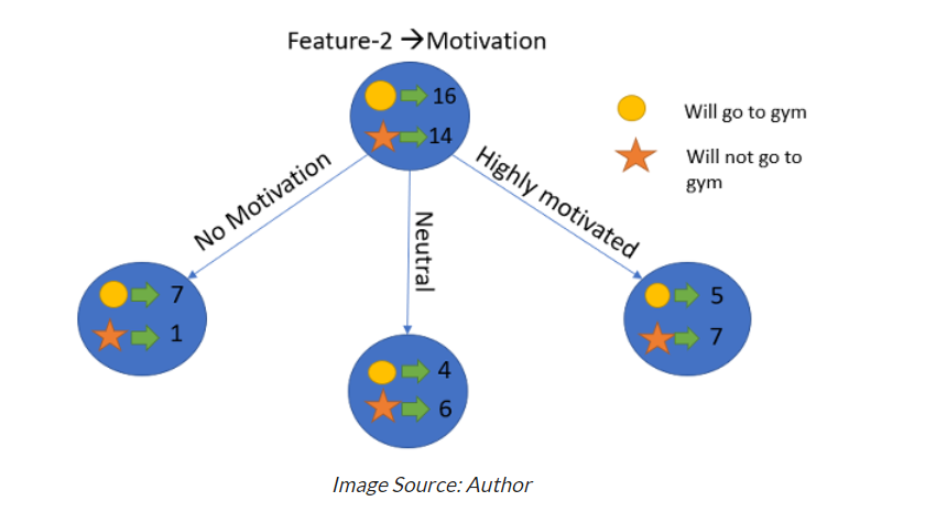 Here we can see that when the energy is “high” the entropy is low and hence we can say a person will definitely go to the gym if he has high energy, but what if the energy is low? We will again split the node based on the new feature which is “Motivation”.
