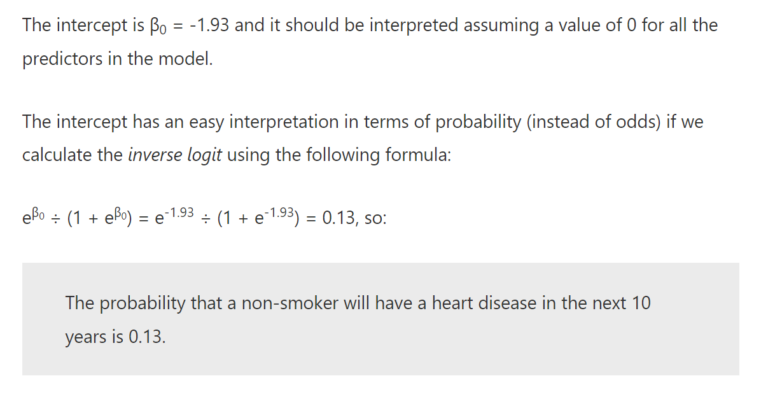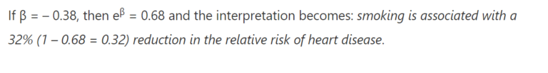 - So increasing the predictor by 1 unit (or going from 1 level to the next) multiplies the odds of having the outcome by eβ.
