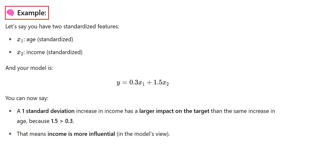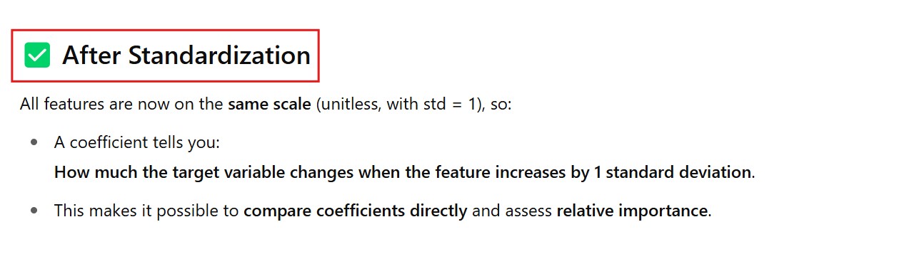 • If input features are standardized (mean=0, std=1), then coefficients reflect relative importance more clearly.