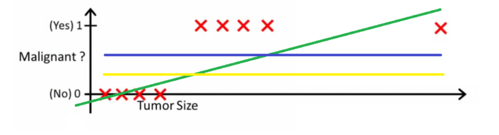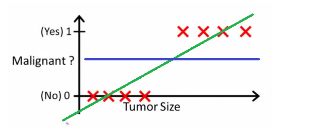 - Here the threshold value is 0.5, which means if the value of h(x) is greater than 0.5 then we predict malignant tumor (1) and if it is less than 0.5 then we predict benign tumor (0).