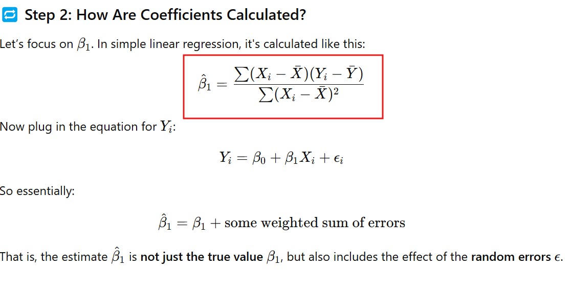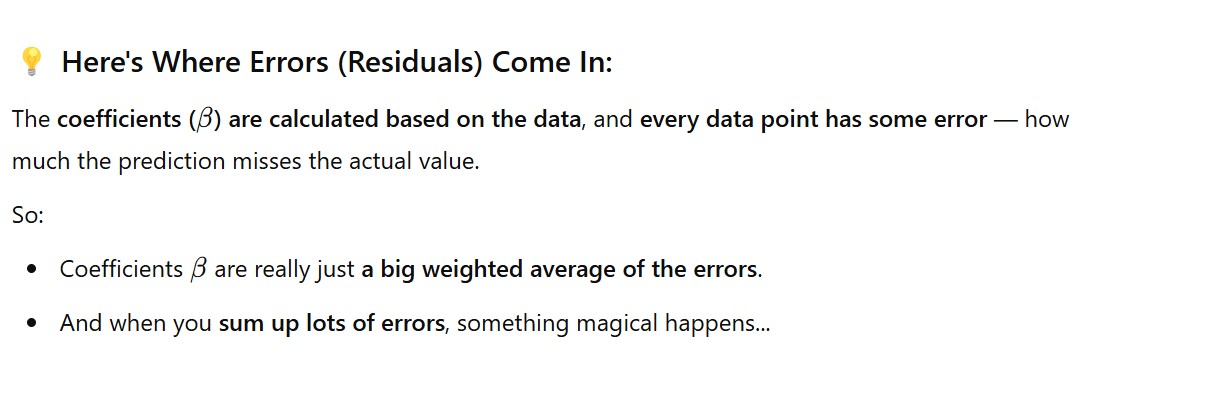 - Here we will take multiple sum of the error terms for different samples to calculate the distribution of the coefficients, and then plot and see, it will be normally distributed.
