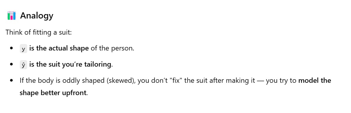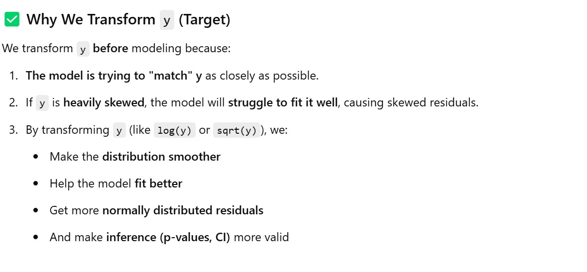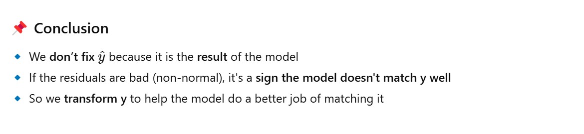 - Hence what we will do it to transform the outcome ‘y’ to follow the normal distribution and hence the residuals will also follow the normal distribution.