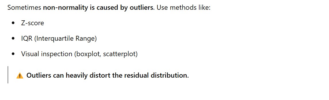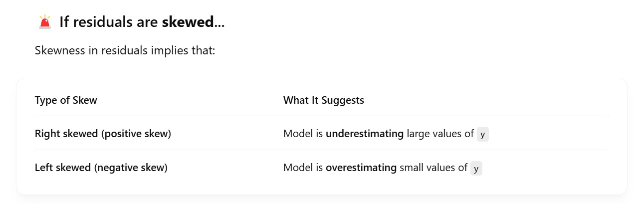 - When the error terms are skewed whether left or right which means, your model is not able to capture the extreme high or extreme low values in the outcome variable which is ‘y’.