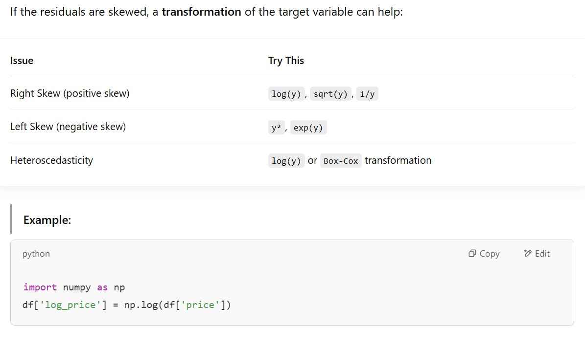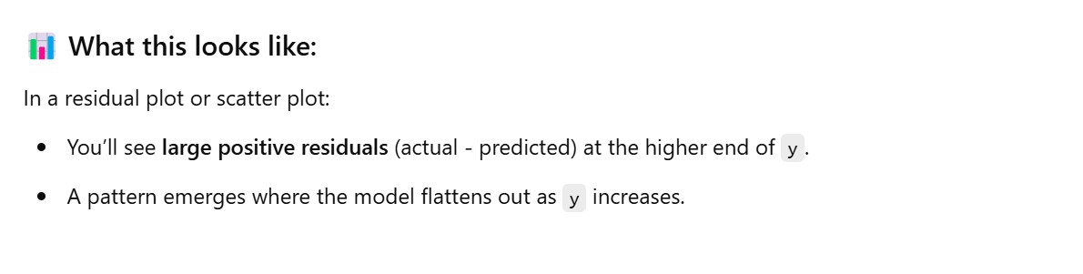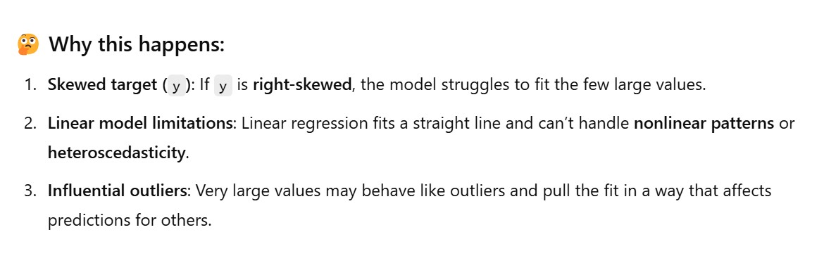 y, the predictions are close. - But for large values (e.g., expensive houses, high salaries), the model fails to capture the true magnitude, predicting values that are too low.