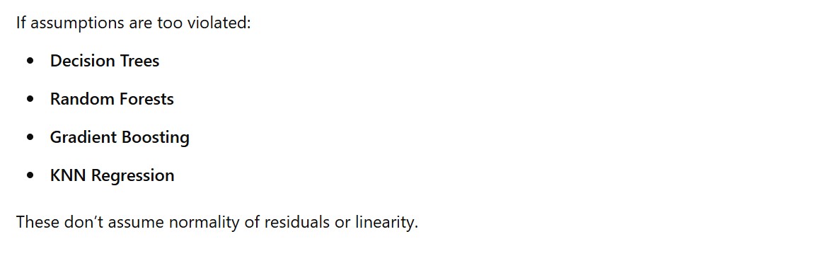 Robust Regression: Robust regression methods are designed to be less sensitive to violations of assumptions, including the assumption of normally distributed errors. These methods aim to reduce the impact of outliers or influential observations that may skew the error distribution. Examples of robust regression techniques include the Huber loss function or the M-estimators, which downweight the influence of outliers during estimation.