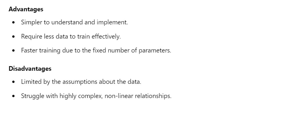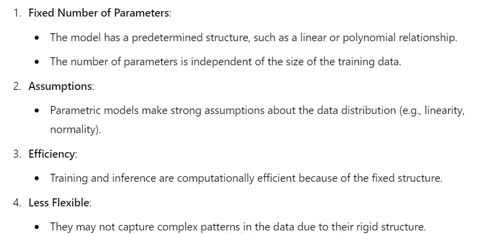 - A parametric model assumes a specific functional form for the relationship between the input features and the output.