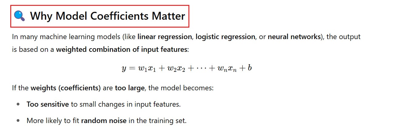 - By adding the penalty to the loss function, the optimization process favors smaller coefficient values, reducing the likelihood of overfitting.