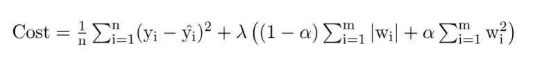 The Elastic Net regularization adds a penalty term to the model’s cost function that combines both the L1 and L2 regularization terms. The cost function is augmented with two hyperparameters: alpha and lambda.