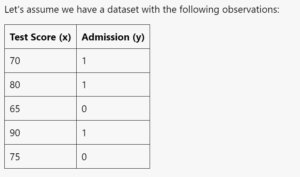 • Suppose we have a binary classification problem where the dependent variable is whether a student is admitted to a university (1 for admitted, 0 for not admitted), and the independent variable is the student’s test score.