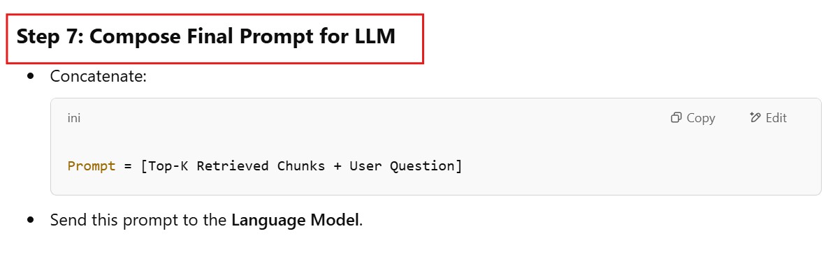 # Concatenate the top-K retrieved chunks with the user question to create the final prompt