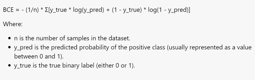 - Binary Cross-Entropy (BCE) Loss: Suitable for binary classification tasks, where the model predicts the probability of belonging to one of two classes. BCE loss measures the dissimilarity between predicted probabilities and true binary labels.