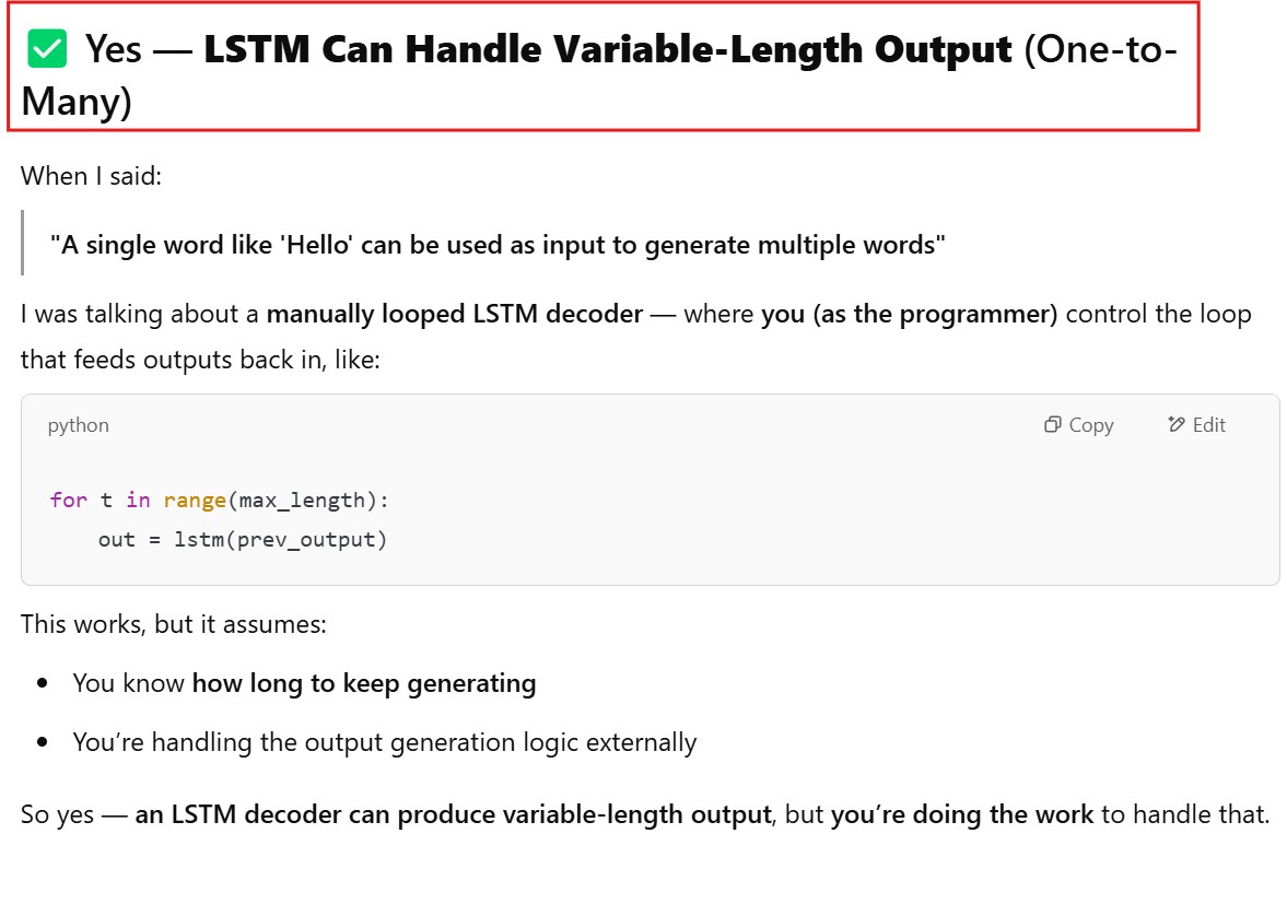 - Problem – 3: Output Length Needs to Be Predefined: A standard LSTM model expects a fixed output length because it works in a one-to-one or many-to-one fashion.