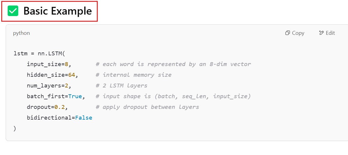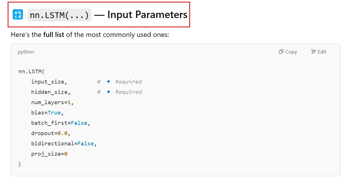 input_tensor = torch.randn(32, 10, 8) # (batch_size=32, seq_len=10, input_size=8) - Here seq_len = 10 signifies the total 10 number of words i have in the sentence and i will have 10 time steps.
