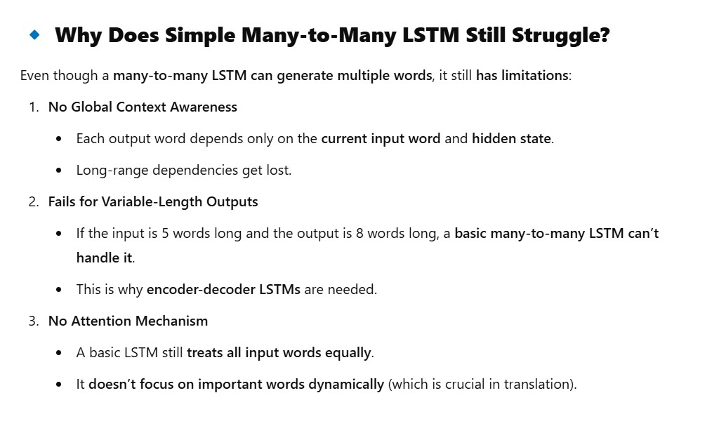 - Problem-2: It has Fixed-Length Hidden State Bottleneck – LSTMs process sequences one step at a time and store all learned information in a fixed-size hidden state (often the last hidden state).