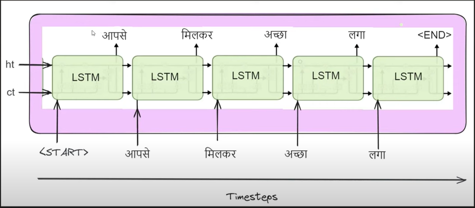 - In the second time step, you will pass the output of the first time step which is ‘आपसे’ as an input with the internal (ht, ct) vectors.