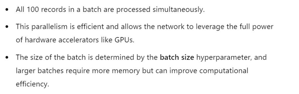 For a batch of 100 records in a neural network, all 100 records are passed through the network at the same time (in parallel), not one by one.