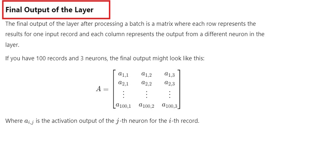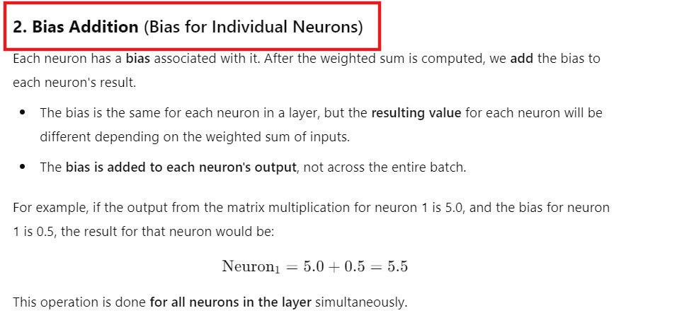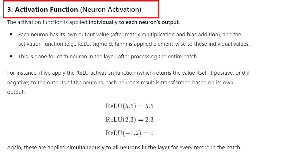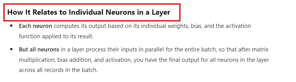 - Yes, the operations we discussed (matrix multiplication, bias addition, and activation) apply to individual neurons as part of the neural network, but they are performed for all neurons in a layer simultaneously when processing a batch of data.