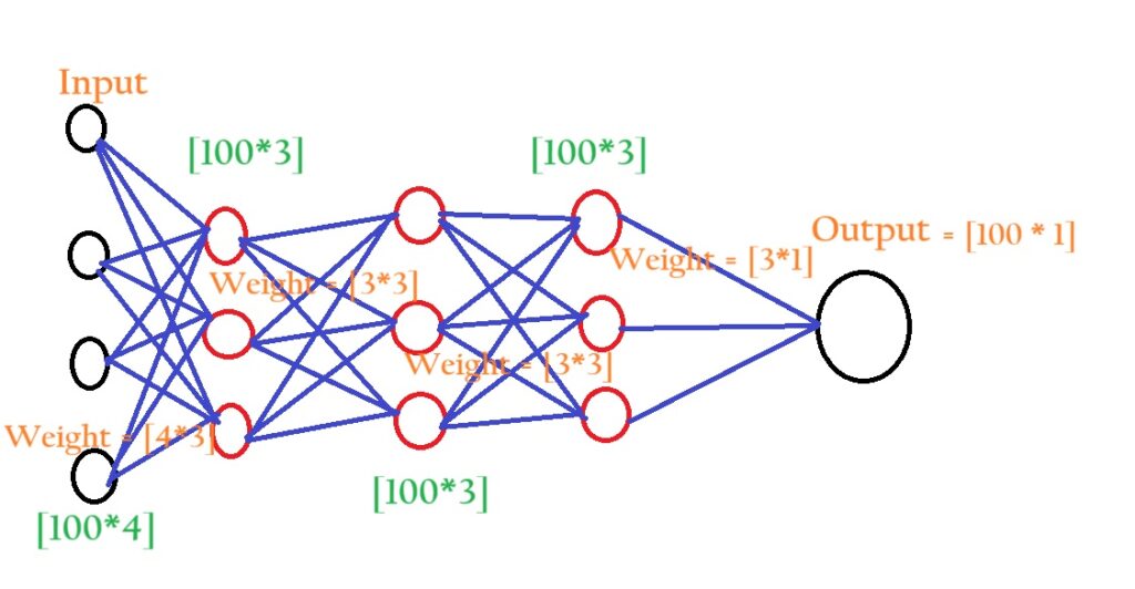 - 1st Layer = [100*4] * [4*3] = [100*3].