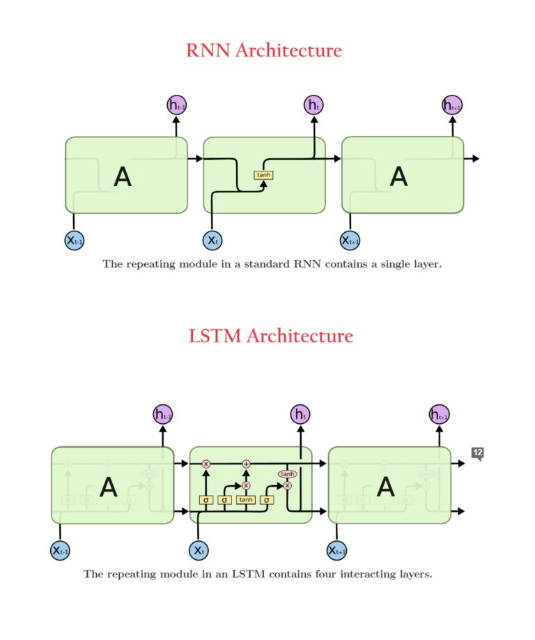 - RNN has a simple architecture. However, LSTM has a complex architecture inside it.