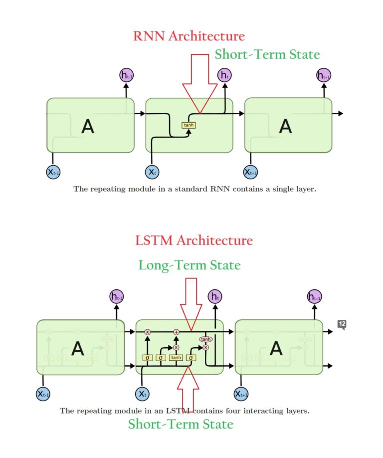 - The biggest difference between RNN & LSTM is that RNN only maintains a single state whereas LSTM maintains two states that is short-term and long-term states.