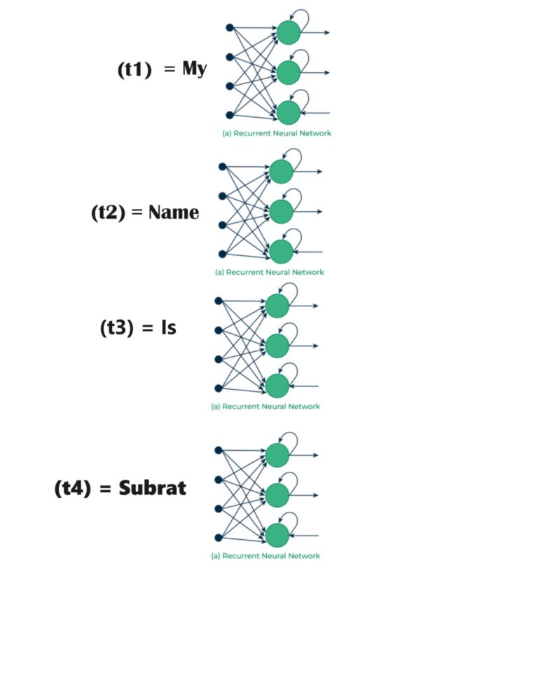 - Here we have 4 words. Hence we will create 4 time steps, t1, t2, t3, t4.