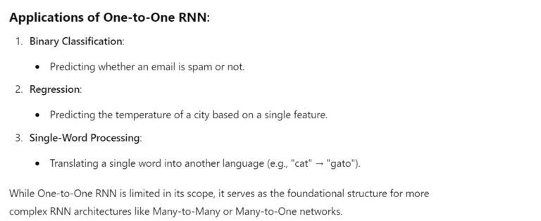 • A One-to-One RNN (Recurrent Neural Network) is the simplest type of RNN architecture where there is exactly one input and one output.
