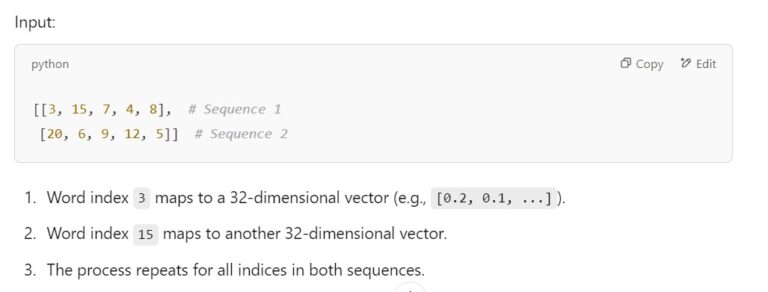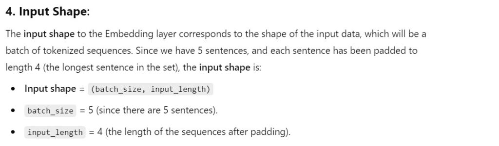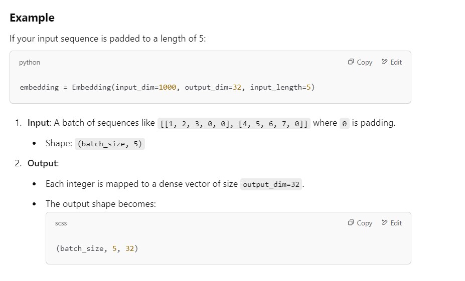 Embedding(input_dim=1000, output_dim=32, input_length=5),  # Sequence of length 5