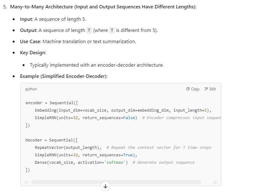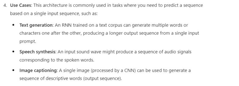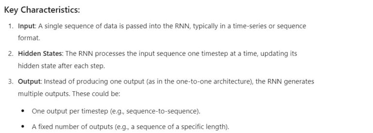 • This means that while there is one input sequence, the model generates a sequence of multiple outputs, typically one for each timestep or for a predefined sequence length.