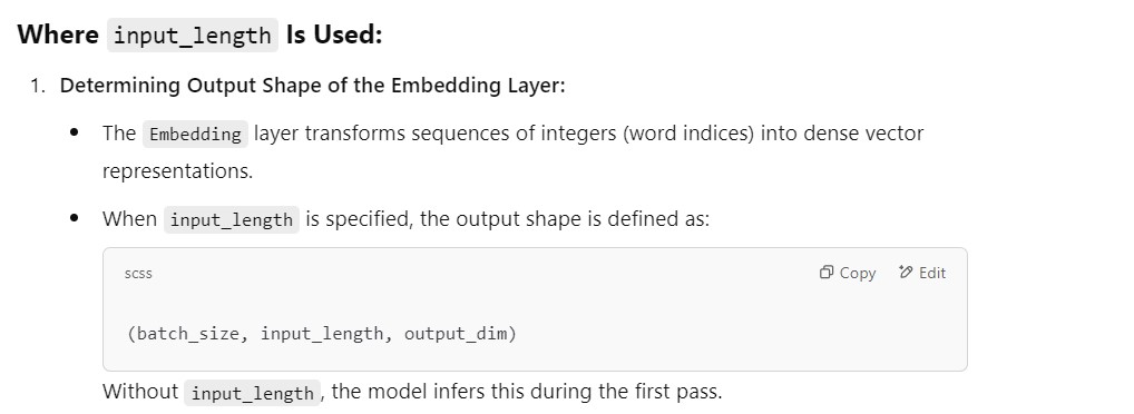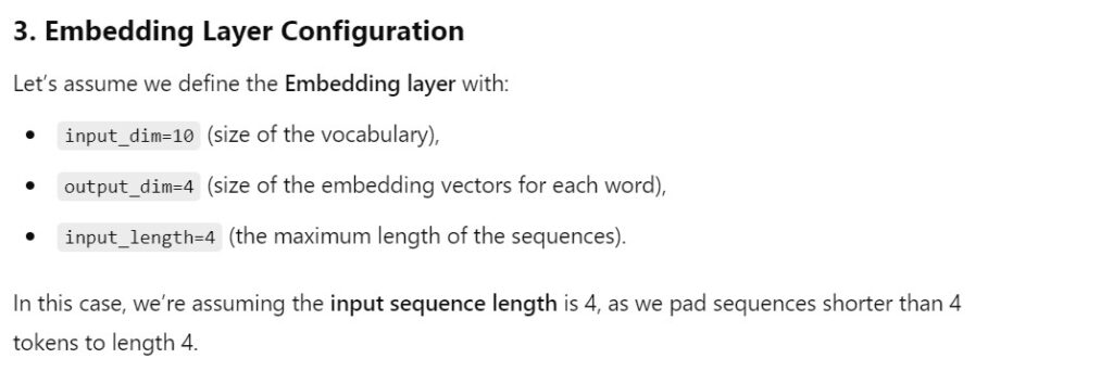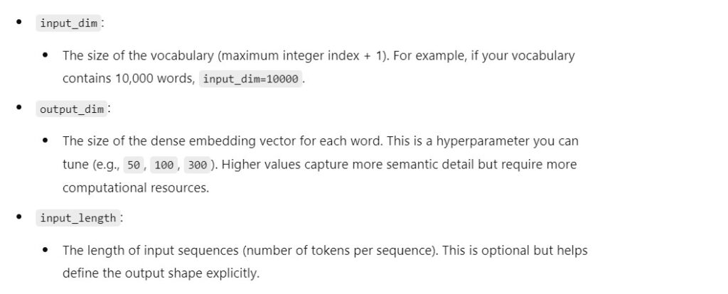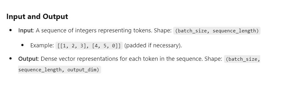Embedding(input_dim=vocab_size, output_dim=embedding_dim, input_length=input_length)