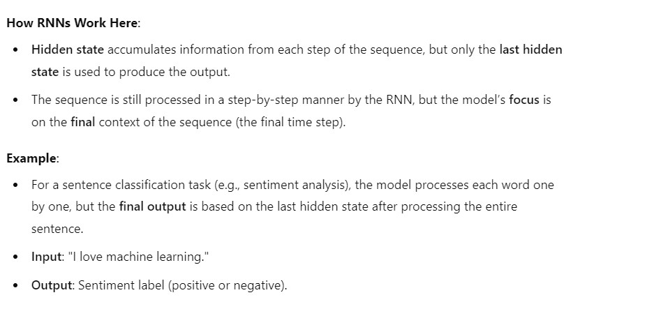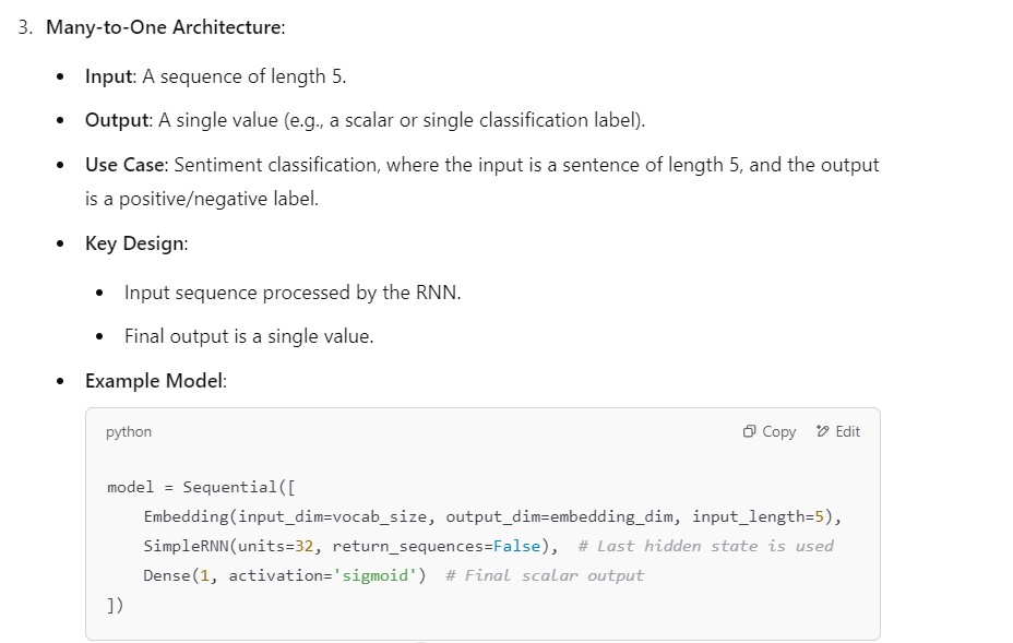 • In One-To-One architecture , return_sequences=False is set False , because we want the model to output a single value (or vector) after processing the entire input sequence. This is typical for tasks where we want to map an entire sequence (input) to a single output.