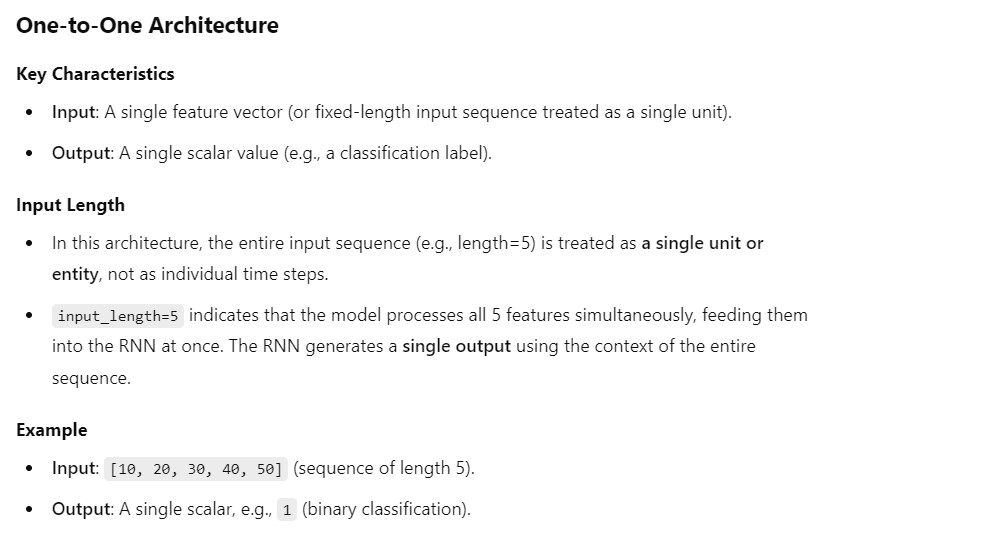 6. how in case of One-to-One Architecture input_length can be 5 but not in one to many processes the sequence as a whole. and entire input sequence step by step (or token by token).