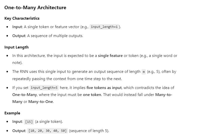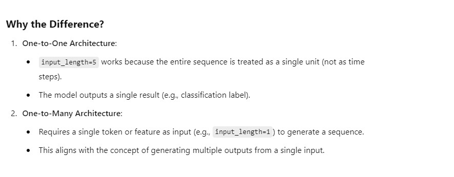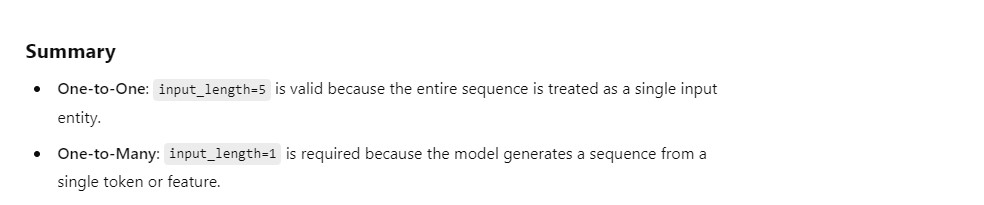 • The distinction between the One-to-One and One-to-Many architectures lies in how the input and output are processed, rather than the value of input_length itself.