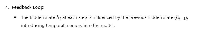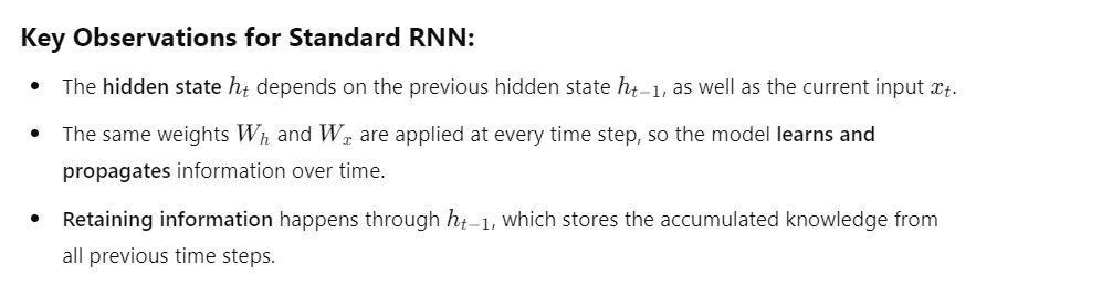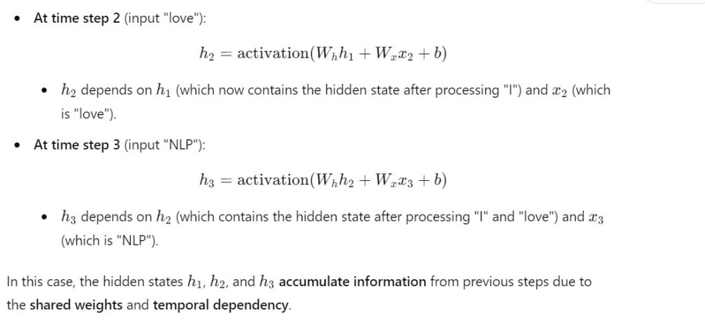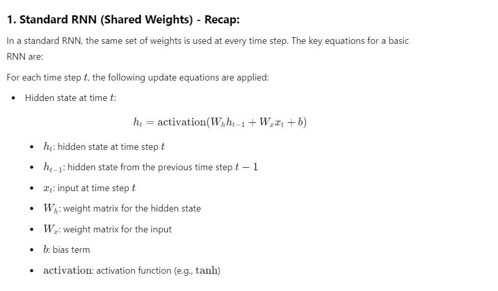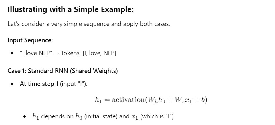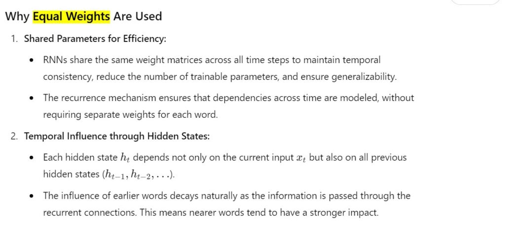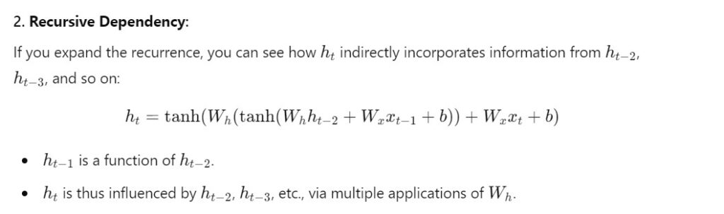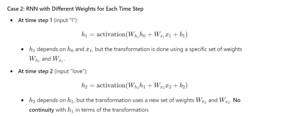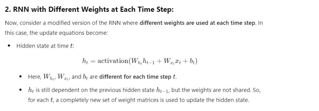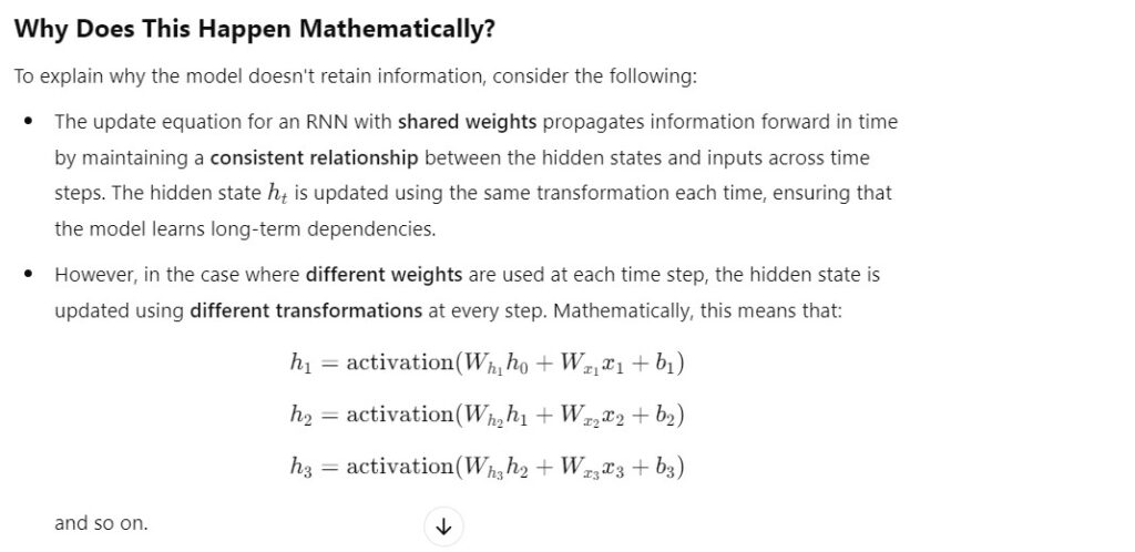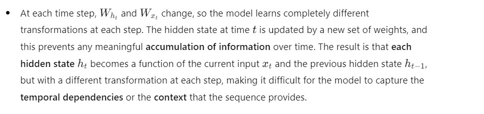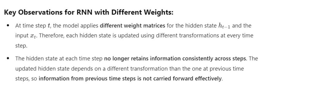 • Let’s explain mathematically how using different weights at each time step in an RNN leads to a situation where it doesn’t retain information from previous tokens, i.e., how the network becomes unable to process the sequence context.
