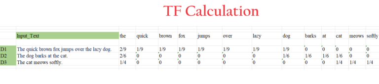 - “the” appears 2 times, so TF(“the”) = 2 / 6 = 0.333